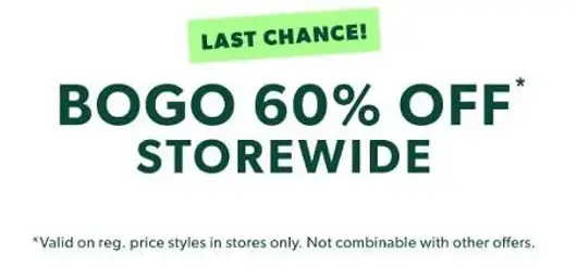 Last chance! Shop in store and enjoy buy one, get one 60% off everything.