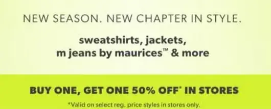 Hurry! Shop in store and enjoy buy one, get one 50% off sweatshirts, jackets, m jeans by maurices™ & more.